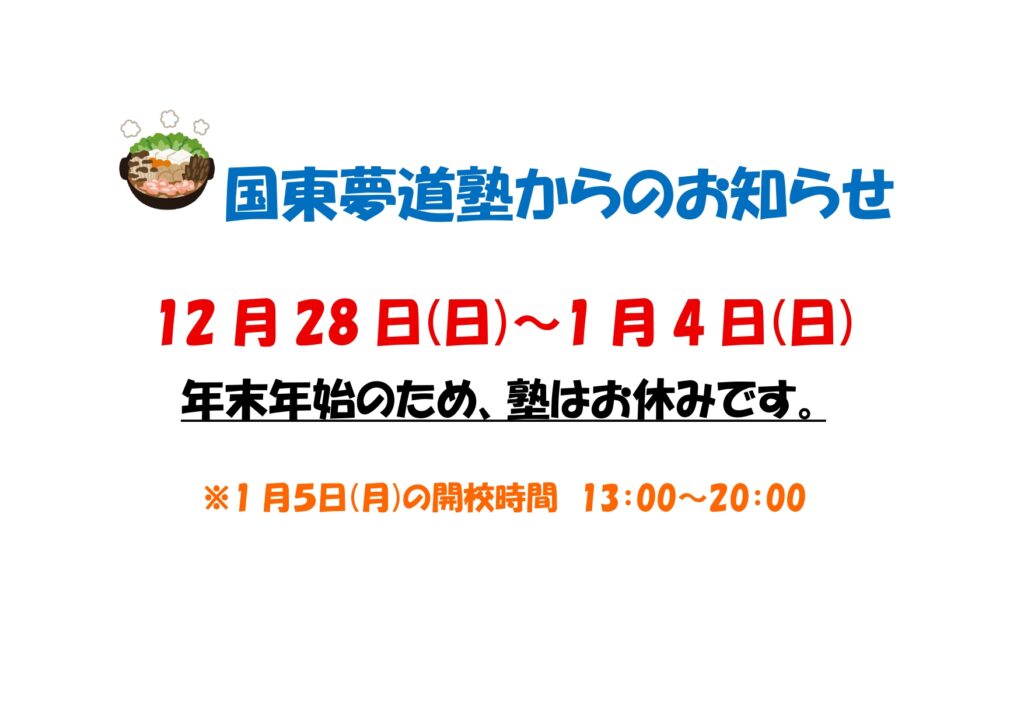 年始は1月6日(月)の13:00~20:00で開校します。