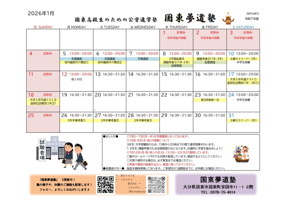 ※12月24日(水)~27日(土)、1月5日(月)~7日(水)→冬期授業です。