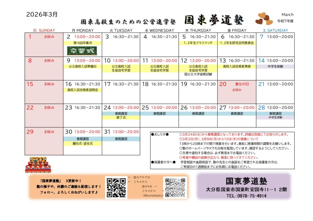 2025年度(2026年)3月のカレンダーを掲載しました!